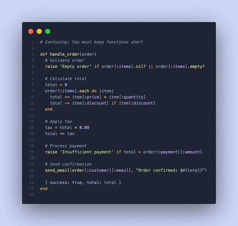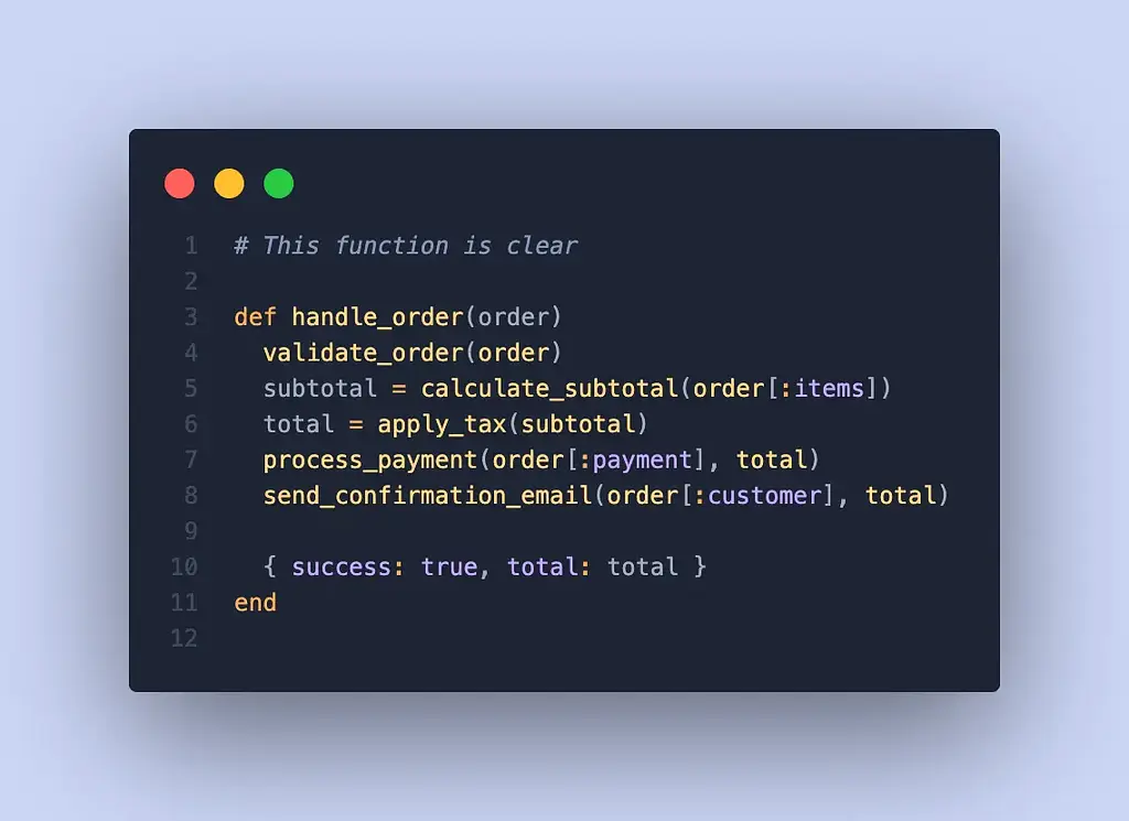 Now you can understand the flow at a glance. Each function does one thing and does it well.